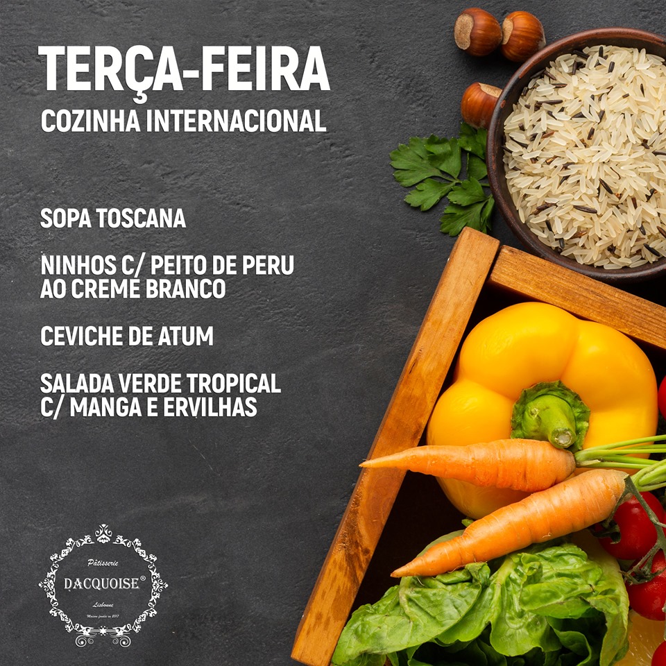 Agora, a Dacquoise tem mais oferta. Depois de ter apostado nos brunches, a pastelaria francesa passa a ter almoços de terça a sexta-feira, inspirados na cozinha do Mundo. Começa por cozinha internacional, às quartas-feiras é a vez da cozinha francesa brilhar, um dia depois chega a vez da asiática e sexta cabe à brasileira fazer as delícias dos clientes.