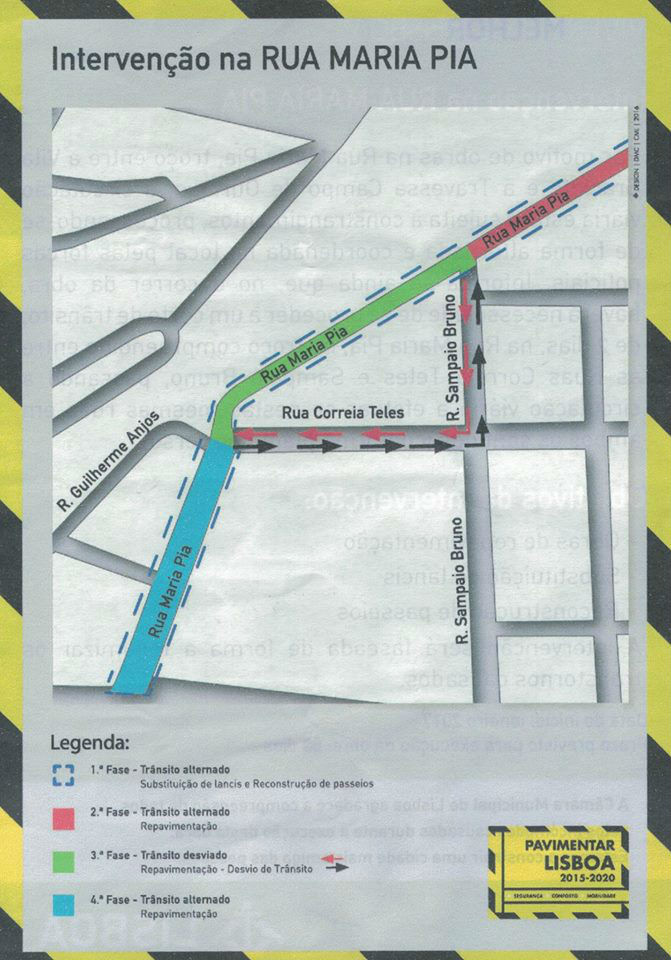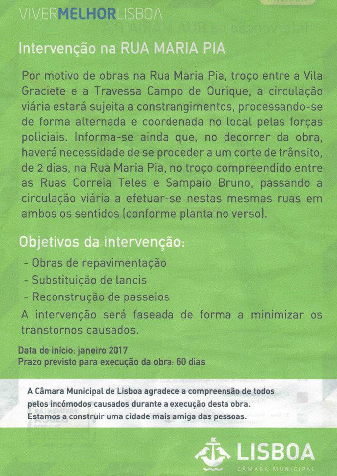 Por motivo de obras na Rua Maria Pia, troço entre a Vila Graciete e a Travessa Campo de Ourique, a circulação viária estará sujeita a constrangimento, processando-se de forma alternada e coordenada no local pelas forças policiais. Informa-se a inda que, no decorrer da obra, haverá necessidade de se proceder a um corte de trânsito, de dois dias, na Rua Maria Pia, no troço compreendido entre as Ruas Correia Teles e Sampaio Bruno, passando a circulação viária a efetuar-se nestas mesmas ruas em ambos os sentidos (conforme imagem anexada).