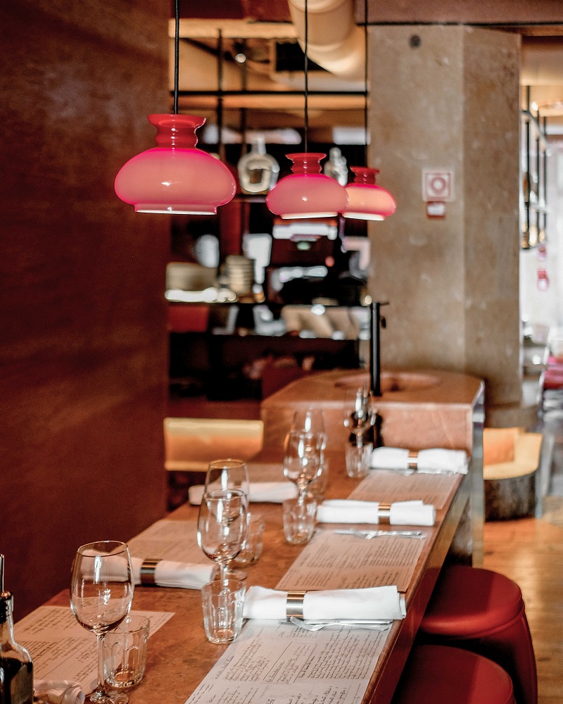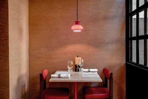Centro nevrálgico de todas as autênticas casas italianas, a cozinha ocupa um lugar de destaque, e é com ela que nos deparamos assim que entramos pela porta vermelha do número 26A da Rua 4 da Infantaria. Na sala, cujo design de interiores foi desenvolvido por Inês Moura, imperam os tons neutros e a crueza dos mármores, em contraste com os candeeiros vermelhos (o design de iluminação ficou a cargo de Joana Forjaz) que acentuam a elegância e intemporalidade do espaço. Nas traseiras, o restaurante conta ainda com duas zonas de esplanada prontas para receber o verão.